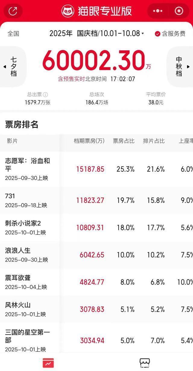 2025年开年至今,中国电影市场佳片不断。从春节档的“史上最强”开局,到暑期档的“类型多元”爆发,再到国庆档的“多片竞逐”,每个关键档期都有力拉动了电影市场热度。 截至目前,今年全国已上映影片数量超300部。涵盖历史、喜剧、动画、奇幻、剧情等多个类型,既能满足家庭观众的合家欢需求,也能适配观众的个性化审美。 当下正处国庆档观影高峰 据网络平台实时票房数据 截至10月2日17时02分 2025年国庆档电影总票房 (含预售) 突破6亿元 《志愿军:浴血和平》 《731》《刺杀小说家2》 位列前三