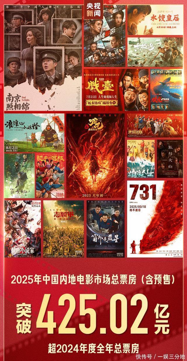 今年以来 中国电影票房持续飘红 据“央视新闻”报道 截至10月2日 全年电影总票房 突破425.02亿元 超2024年全年总票房